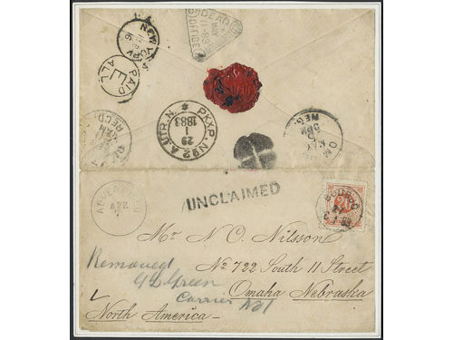 Sweden. Facit 33 on cover, 20 öre on cover sent from WENDELSBY 28.12.1885 to USA. Undeliverable with pmk UNCLAIMED and l.. Läs mer Sweden. Facit 33 on cover, 20 öre on cover sent from WENDELSBY 28.12.1885 to USA. Undeliverable with pmk UNCLAIMED and label 'Letter returned to the office by Carrier'. Visa mindre