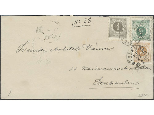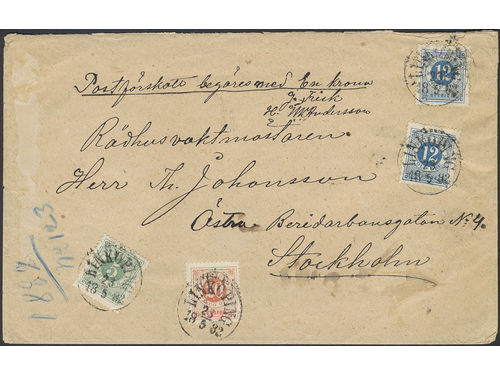 Sweden. Facit 30, 32, 33 on cover, 5+2×12+20 öre on cash on delivery cover sent from LINKÖPING 23.5.1882 to STOCKHOLM AN.. Läs mer Sweden. Facit 30, 32, 33 on cover, 5+2×12+20 öre on cash on delivery cover sent from LINKÖPING 23.5.1882 to STOCKHOLM ANK: A C K 24.5.1882. Scarce combination – only three recorded. Visa mindre