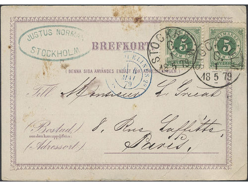 Sweden. Facit 30 on cover, 2×5 öre on early postcard sent from STOCKHOLM C 1.5.1879 to France, with arrival pmk SUEDE-ER.. Läs mer Sweden. Facit 30 on cover, 2×5 öre on early postcard sent from STOCKHOLM C 1.5.1879 to France, with arrival pmk SUEDE-ERQUELINES 4.MAI.79. Privately manufactured postcards were not allowed abroad until 1.4.1886. Scarce item. Visa mindre