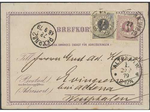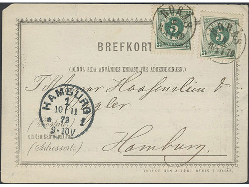Sweden. Facit 30 on cover, 2×5 öre on early postcard (one round corner) sent from BORÅS 8.11.1879 via PKXP Nr 2 9.11.187.. Läs mer Sweden. Facit 30 on cover, 2×5 öre on early postcard (one round corner) sent from BORÅS 8.11.1879 via PKXP Nr 2 9.11.1879 to HAMBURG 10.11.79. Privately manufactured postcards were not allowed abroad until 1.4.1886. Scarce item. Visa mindre