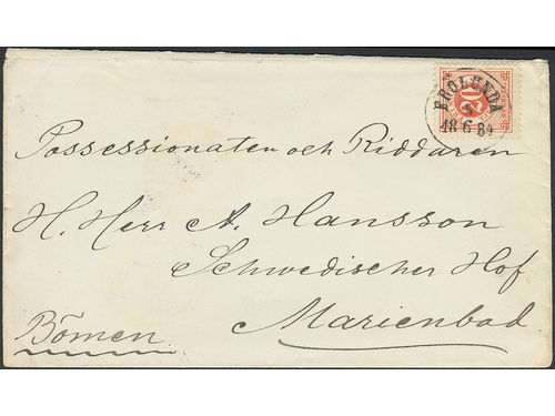 Sweden. Facit 33 on cover, 20 öre on beautiful cover sent from FRÖLUNDA 5.6.1884 to Austria with arrival pmk MARIENBAD on the reverse. Sweden. Facit 33 on cover, 20 öre on beautiful cover sent from FRÖLUNDA 5.6.1884 to Austria with arrival pmk MARIENBAD on the reverse. Visa mindre