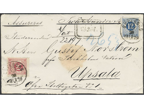 Sweden. Facit 36, 32 on cover, 12+50 öre on insured cover cancelled with beehive pmks GÖTEBORG 28.10.1879 to Uppsala. Sweden. Facit 36, 32 on cover, 12+50 öre on insured cover cancelled with beehive pmks GÖTEBORG 28.10.1879 to Uppsala. Visa mindre