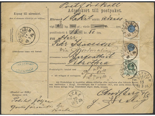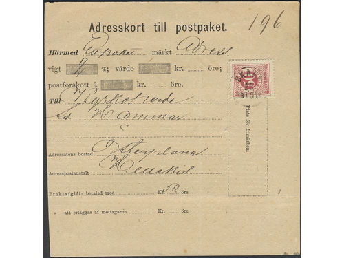 Sweden. Facit 38, 30 on cover, 5 öre + 2×1 kr on address card for cash on delivery parcel sent from STOCKHOLM SÖD 14.3.1.. Läs mer Sweden. Facit 38, 30 on cover, 5 öre + 2×1 kr on address card for cash on delivery parcel sent from STOCKHOLM SÖD 14.3.1884 'via Nordmaling' to Dorotea. Creases. Visa mindre