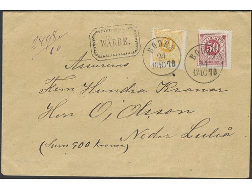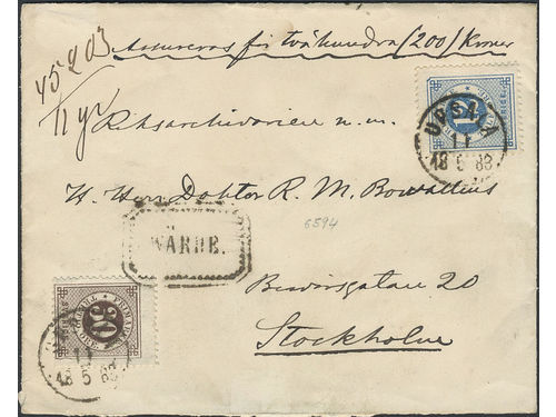 Sweden. Facit 36, 34 on cover, 24+50 öre on insured cover sent from UPSALA 4.6.1882 to Stockholm. Sweden. Facit 36, 34 on cover, 24+50 öre on insured cover sent from UPSALA 4.6.1882 to Stockholm. Visa mindre