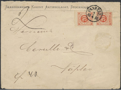 Sweden. Facit 33 on cover, 2×20 öre on double rate cover sent from PKXP Nr 2 2.4.1890 to Italy, with arrival pmks on the.. Läs mer Sweden. Facit 33 on cover, 2×20 öre on double rate cover sent from PKXP Nr 2 2.4.1890 to Italy, with arrival pmks on the reverse. Front with tiny hole. Visa mindre