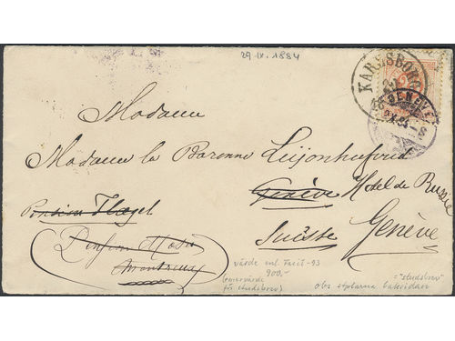 Sweden. Facit 33 on cover, 20 öre on cover sent from KARLSBORG 29.9.1884 via PKXP No 2 B UTR N 30.9.1884 to Switzerland... Läs mer Sweden. Facit 33 on cover, 20 öre on cover sent from KARLSBORG 29.9.1884 via PKXP No 2 B UTR N 30.9.1884 to Switzerland. Forwarded with several Swizz postmarks. Visa mindre