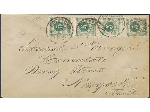 Sweden. Facit 30 on cover, 4×5 öre in strip of four on cover sent from GÖTEBORG Lbr 5.8.1885 via PKXP No 62 6.8.1885 to.. Läs mer Sweden. Facit 30 on cover, 4×5 öre in strip of four on cover sent from GÖTEBORG Lbr 5.8.1885 via PKXP No 62 6.8.1885 to USA. Arrival pmk NEW YORK PAID ALL 17.AUG.85. The cover with small pin holes at right. Visa mindre