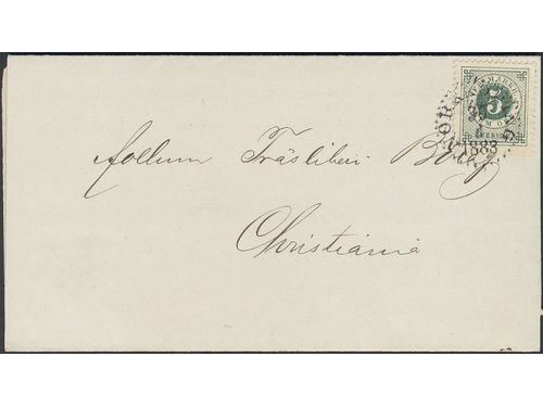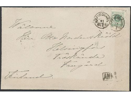 Sweden. Facit 30 on cover, 5 öre on printed matter sent from NÄFVERQVARN 31.12.1883 via STOCKHOLM C 1.1.1884 to Finland... Läs mer Sweden. Facit 30 on cover, 5 öre on printed matter sent from NÄFVERQVARN 31.12.1883 via STOCKHOLM C 1.1.1884 to Finland. Arrival pmk ANK 3.1. The edges of the cover is somewhat folded back. Visa mindre