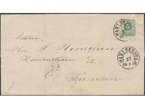 Sweden. Facit 30 on cover, 5 öre on printed matter sent from CARLSKRONA 27.4.1880 via PKXP No 2 28.4.1880 to Germany. Arrival pmk MUNCHEN 30.APR. Sweden. Facit 30 on cover, 5 öre on printed matter sent from CARLSKRONA 27.4.1880 via PKXP No 2 28.4.1880 to Germany. Arrival pmk MUNCHEN 30.APR. Visa mindre