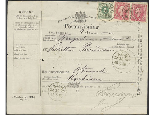 Sweden. Facit 30, 39 on cover, 5+2×10 öre on money order cancel 'Omstående belopp sändes Eder från Herrar Cramer & C.. Läs mer Sweden. Facit 30, 39 on cover, 5+2×10 öre on money order cancel 'Omstående belopp sändes Eder från Herrar Cramer & Co i Chicago, Malmö ... Skånes Enskilda Bank', sent from MALMÖ 30.6.1886 to Östmark. The form with folds and a tear. Visa mindre