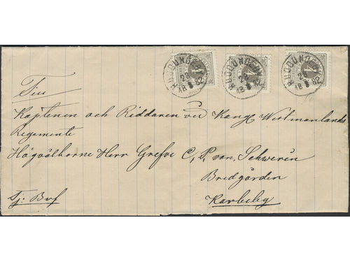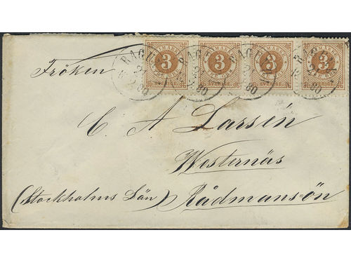Sweden. Facit 28 on cover, 4×3 öre in STRIP OF FOUR on cover sent from RAGUNDA 21.2.1880 via STOCKHOLM K.E. 24.2.1880 to Rådmansön. Sweden. Facit 28 on cover, 4×3 öre in STRIP OF FOUR on cover sent from RAGUNDA 21.2.1880 via STOCKHOLM K.E. 24.2.1880 to Rådmansön. Visa mindre