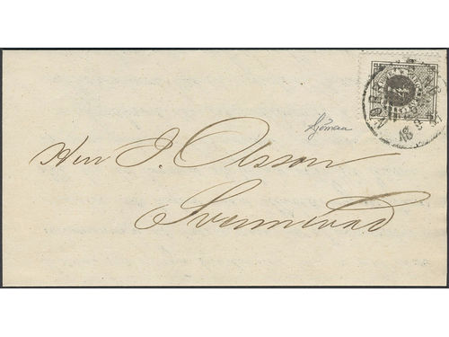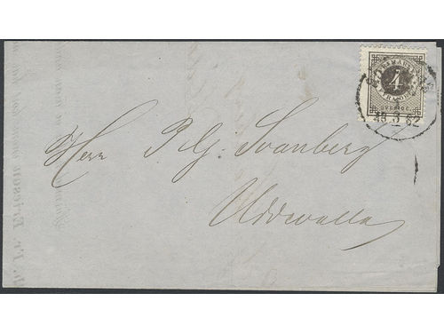 Sweden. Facit 28c on cover, 3 öre dark orange-brown. Cover sent from SÖDERHAMN 22.7.1878 to Alfta. Scarce shade on cover. SEK 2500 Sweden. Facit 28c on cover, 3 öre dark orange-brown. Cover sent from SÖDERHAMN 22.7.1878 to Alfta. Scarce shade on cover. SEK 2500 Visa mindre