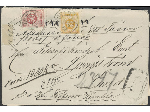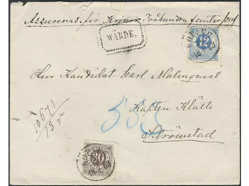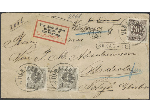 Sweden. Facit 29, 35 used, 2×4+30 öre on registered cover sent from ULRICEHAMN 5.4.1881 via STOCKHOLM K.E. 7.4.1881, Ger.. Läs mer Sweden. Facit 29, 35 used, 2×4+30 öre on registered cover sent from ULRICEHAMN 5.4.1881 via STOCKHOLM K.E. 7.4.1881, Germany and Russia, to Notsjö Glasbruk, Finland. German label 'Vom Ausland über Bahnpost 17 Kiel-Hamburg. Eingeschrieben' and Russian cancel 3AKA3HOE plus transit marks on the reverse. Finnish pmk WIBORG 13.4.1881. Highly interesting item. Visa mindre