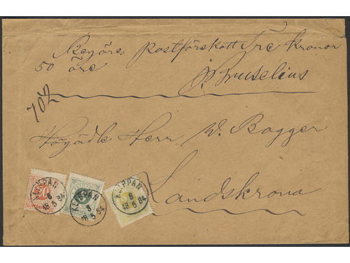 Sweden. Facit 34f, 30h, 33e on cover, 24 öre lemon yellow together with 5+20 öre on beatufil cash on delivery cover sent.. Läs mer Sweden. Facit 34f, 30h, 33e on cover, 24 öre lemon yellow together with 5+20 öre on beatufil cash on delivery cover sent from KLIPPAN 8.5.1884 to Landskrona. Scarce shade on cover. Certificate HOW 'no faults' (2007). Ex. Postiljonen 2011 (€ 1400). Visa mindre