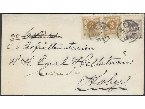 Sweden. Facit 28 on cover, 3 öre on local cover cancelled SALA 7.7.1879, then additionally franked with 3×3 öre and forw.. Läs mer Sweden. Facit 28 on cover, 3 öre on local cover cancelled SALA 7.7.1879, then additionally franked with 3×3 öre and forwarded to STOCKHOLM C 8.7.1879. Visa mindre