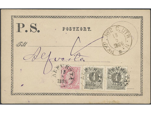 Sweden. Facit 29, etc. on cover, 2×4+10 öre on beautiful PS-card, used for an isnufficiently prepaid insured cover, cancelled ALFVESTA 18.5.1886. Sweden. Facit 29, etc. on cover, 2×4+10 öre on beautiful PS-card, used for an isnufficiently prepaid insured cover, cancelled ALFVESTA 18.5.1886. Visa mindre
