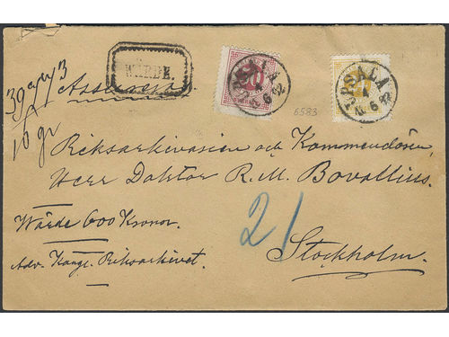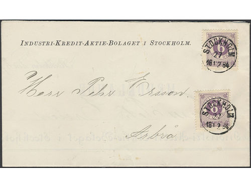 Sweden. Facit 34, 35 on cover, Registered 3-fold cover from Sveriges Allmänna Hypoteks Bank, sent from STOCKHOLM 15.10.1.. Läs mer Sweden. Facit 34, 35 on cover, Registered 3-fold cover from Sveriges Allmänna Hypoteks Bank, sent from STOCKHOLM 15.10.1879 via UPSALA 17.10.1879 to Fasterna. Small imperfections. According to Ferdén only one other registered cover recorded with this combination. Visa mindre