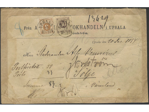 Sweden. Facit 28, 35 on cover, 3+30 öre on cash on delivery printed matter sent from UPSALA 28.12.1884 to Sölje. Scarce.. Läs mer Sweden. Facit 28, 35 on cover, 3+30 öre on cash on delivery printed matter sent from UPSALA 28.12.1884 to Sölje. Scarce rate – only two recorded with perf. 13. Visa mindre