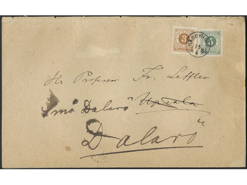 Sweden. Facit 28e, 30g on cover, 3+5 öre on beautiful printed matter (booklet) sent from NÄSBYHOLM 15.8.1883 to Uppsala,.. Läs mer Sweden. Facit 28e, 30g on cover, 3+5 öre on beautiful printed matter (booklet) sent from NÄSBYHOLM 15.8.1883 to Uppsala, then forwarded to Dalarö. Superb. Visa mindre