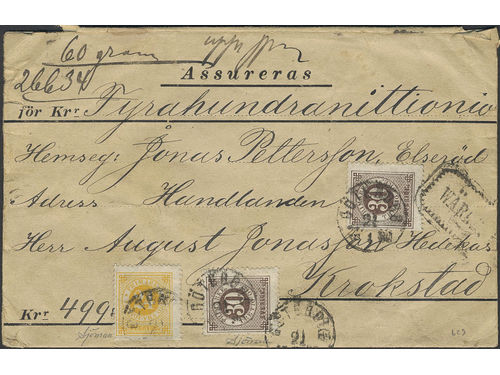 Sweden. Facit 34, 36 on cover, 24+50 öre on insured cover sent from YSTAD 27.4.1883 to Lund. Sweden. Facit 34, 36 on cover, 24+50 öre on insured cover sent from YSTAD 27.4.1883 to Lund. Visa mindre