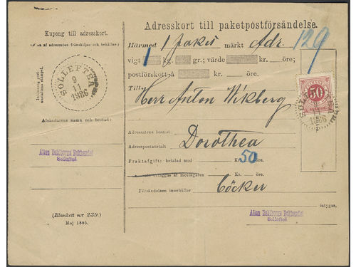 Sweden. Facit 36 on cover, 50 öre on beautiful address card for parcel sent from SOLLEFTEÅ 9.11.1886 to Dorotea. Sweden. Facit 36 on cover, 50 öre on beautiful address card for parcel sent from SOLLEFTEÅ 9.11.1886 to Dorotea. Visa mindre