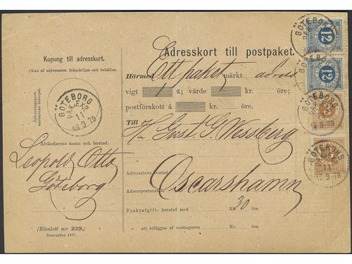 Sweden. Facit 28, 32 on cover, 2×3+2×12 öre on beautiful address card for parcel sent from GÖTEBORG PAK-EXP 11.9.1879 to.. Läs mer Sweden. Facit 28, 32 on cover, 2×3+2×12 öre on beautiful address card for parcel sent from GÖTEBORG PAK-EXP 11.9.1879 to Oskarshamn. Scarce combination, only two recorded. Visa mindre