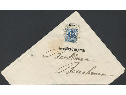 Sweden. Facit 32 on cover, 12 öre on railway telegram (Köping–Uttersbergs Jernväg) cancelled BERNSHAMMAR 16.8.1881. Sweden. Facit 32 on cover, 12 öre on railway telegram (Köping–Uttersbergs Jernväg) cancelled BERNSHAMMAR 16.8.1881. Visa mindre