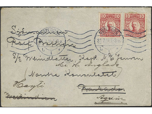 Sweden. Facit 82 on cover, 10 öre red. Two ex. canc. GÖTEBORG 31.7.14 on cover sent to HAITI, arrival canc. 12 SEP 1914. Scarce destination. Sweden. Facit 82 on cover, 10 öre red. Two ex. canc. GÖTEBORG 31.7.14 on cover sent to HAITI, arrival canc. 12 SEP 1914. Scarce destination. Visa mindre