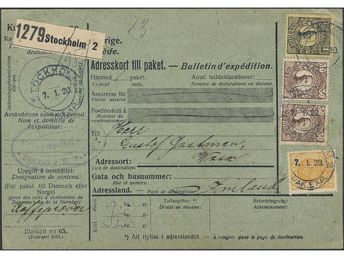 Sweden. Facit 88, etc on cover, Address card for parcel to Finland with fee 162 öre. Canc. STOCKHOLM 7.1.20. Sweden. Facit 88, etc on cover, Address card for parcel to Finland with fee 162 öre. Canc. STOCKHOLM 7.1.20. Visa mindre