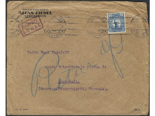 Sweden. Facit 85 on cover, Cover sent from STOCKHOLM 1 18.9.18 to Ukrainian Peoples's Republic, but returned. Very scarce destination. Sweden. Facit 85 on cover, Cover sent from STOCKHOLM 1 18.9.18 to Ukrainian Peoples's Republic, but returned. Very scarce destination. Visa mindre