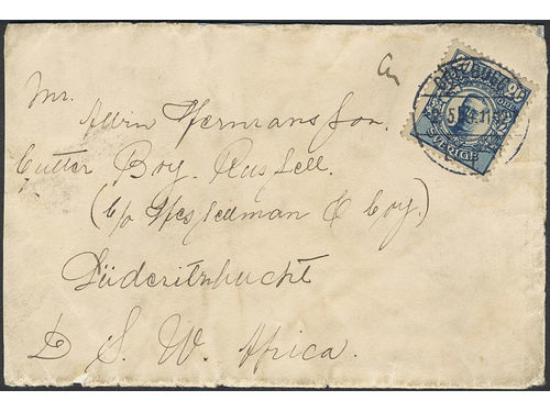Sweden. Facit 85 on cover, 20 öre on cover sent from GÖTEBORG 2.5.14 to German South Africa with arrival pmk LÜDERITZBUC.. Läs mer Sweden. Facit 85 on cover, 20 öre on cover sent from GÖTEBORG 2.5.14 to German South Africa with arrival pmk LÜDERITZBUCHT 29.5.14. Certificate Kaiser (1980). Visa mindre