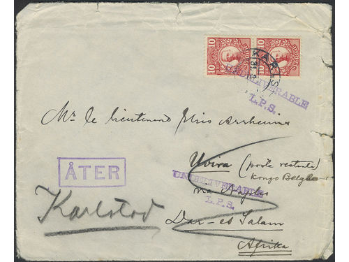Sweden. Facit 82 on cover, 2×10 öre on cover sent from KARLSTAD 31.8.(14) to German East Africa. Undeliverable with pmks.. Läs mer Sweden. Facit 82 on cover, 2×10 öre on cover sent from KARLSTAD 31.8.(14) to German East Africa. Undeliverable with pmks UNDELIVERABLE L.P.S. and ÅTER. Visa mindre