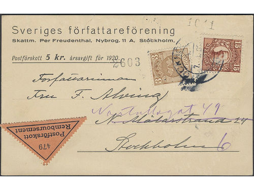 Sweden. Facit 84, 73 on cover, 3+15 öre on LOCAL cash on delivery printed matter, cancelled STOCKHOLM 7.1.20. Scarce postage. Sweden. Facit 84, 73 on cover, 3+15 öre on LOCAL cash on delivery printed matter, cancelled STOCKHOLM 7.1.20. Scarce postage. Visa mindre