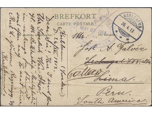 Sweden. Facit 82 on cover, 10 öre on picture postcard (1:a kl. Pansarbåt Manligheten) sent from KARLSHAMN 26.4.13 to Per.. Läs mer Sweden. Facit 82 on cover, 10 öre on picture postcard (1:a kl. Pansarbåt Manligheten) sent from KARLSHAMN 26.4.13 to Peru. Forwarded from Lima to CALLAO 27.MAY.1913. Scarce destination. Visa mindre