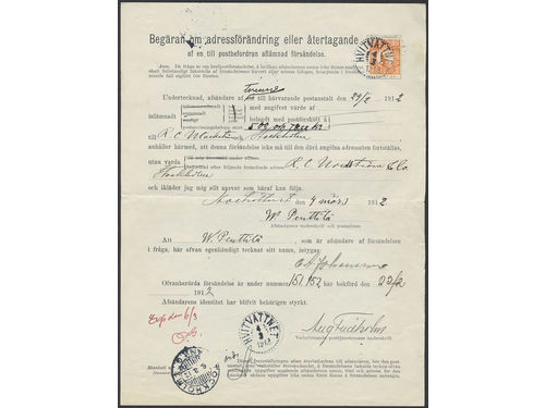 Sweden. Facit 86 on cover, 25 öre on Form No. 131 for withdrawal or change of address, cancelled HVITVATTNET 4.3.1912. Unusually early use. Sweden. Facit 86 on cover, 25 öre on Form No. 131 for withdrawal or change of address, cancelled HVITVATTNET 4.3.1912. Unusually early use. Visa mindre