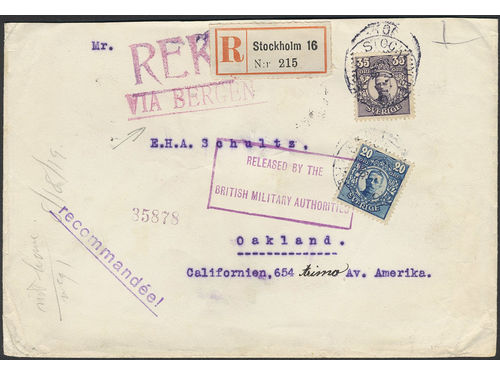 Sweden. Facit 89, 85 on cover, 20+35 öre on registered cover sent from STOCKHOLM 8.7.16 VIA BERGEN to USA with cancel RE.. Läs mer Sweden. Facit 89, 85 on cover, 20+35 öre on registered cover sent from STOCKHOLM 8.7.16 VIA BERGEN to USA with cancel RELEASED BY THE BRITISH MILITARY AUTHORITIES. Arrival pmks on the reverse. Visa mindre