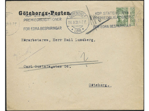 Sweden. Facit 79 v on cover, 5 öre heavily mis-cut (by vending machine?) with large parts of two stamps, on local cover.. Läs mer Sweden. Facit 79 v on cover, 5 öre heavily mis-cut (by vending machine?) with large parts of two stamps, on local cover cancelled GÖTEBORG 1 26.9.21. Visa mindre
