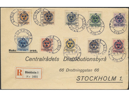 Sweden. Facit 105–14 on cover, 1916 Landstorm I SET (10) on registered cover cancelled STOCKHOLM 1 15.1.17. Sweden. Facit 105–14 on cover, 1916 Landstorm I SET (10) on registered cover cancelled STOCKHOLM 1 15.1.17. Visa mindre
