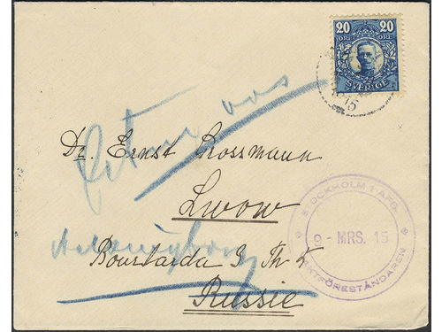 Sweden. Facit 85 on cover, 20 öre on cover sent to Russia with cancel 'Befordringslägenhet saknas' on the reverse and re.. Läs mer Sweden. Facit 85 on cover, 20 öre on cover sent to Russia with cancel 'Befordringslägenhet saknas' on the reverse and returned to HELSINGBORG 10.3.15. Visa mindre