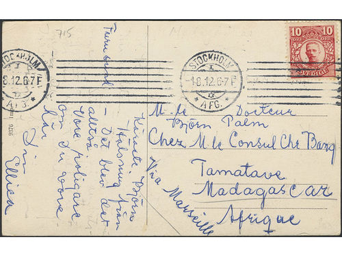 Sweden. Facit 82 on cover, 10 öre on postcard sent from STOCKHOLM 1.8.12 to Madagascar. Sweden. Facit 82 on cover, 10 öre on postcard sent from STOCKHOLM 1.8.12 to Madagascar. Visa mindre