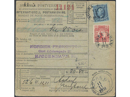 Sweden. Facit 82, 56 used, 10+20 öre as mixed franking on international money order sent from NORRA VRAM 11.11.1911 to D.. Läs mer Sweden. Facit 82, 56 used, 10+20 öre as mixed franking on international money order sent from NORRA VRAM 11.11.1911 to Denmark, with arrival pmk KJØENHAVN K 1.OMB 12.11.11. Visa mindre