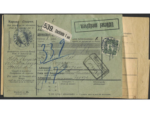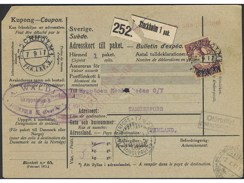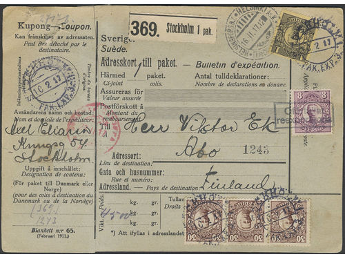 Sweden. Facit 77, 81, 88 on cover, 8+3×30 öre + 1 kr on address card for parcel sent from STOCKHOLM 10.2.17 to Finland... Läs mer Sweden. Facit 77, 81, 88 on cover, 8+3×30 öre + 1 kr on address card for parcel sent from STOCKHOLM 10.2.17 to Finland. One stamp cancelled 'Oförtullat reexportgods'. The coupon is cut off and the rejoined. Visa mindre