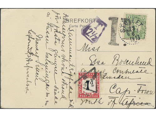 Sweden. Facit 79 on cover, 5 öre on insufficiently prepaid postcard sent from STÖLLET 23.6.1913 to South Africa. Postage.. Läs mer Sweden. Facit 79 on cover, 5 öre on insufficiently prepaid postcard sent from STÖLLET 23.6.1913 to South Africa. Postage due paid with a Transvaal 1 d stamp. Visa mindre