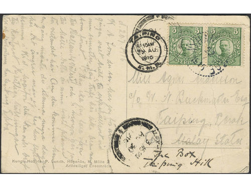 Sweden. Facit 79 on cover, 2×5 öre on postcard sent from NYHAMNSLÄGE 22.7.1916 to the Federated Malay States with arriva.. Läs mer Sweden. Facit 79 on cover, 2×5 öre on postcard sent from NYHAMNSLÄGE 22.7.1916 to the Federated Malay States with arrival pmk TAIPING 29.AU.1916. Crease. Visa mindre