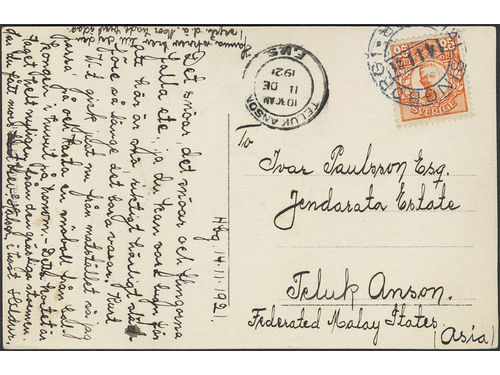 Sweden. Facit 86 on cover, 25 öre on postcard sent from HÄLSINGBORG 1 14.11.21 to Federated Malay States with arrival pmk TELUK ANSON 11.DE.1921. Sweden. Facit 86 on cover, 25 öre on postcard sent from HÄLSINGBORG 1 14.11.21 to Federated Malay States with arrival pmk TELUK ANSON 11.DE.1921. Visa mindre