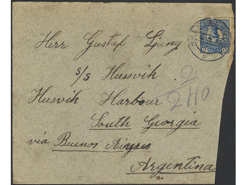Sweden. Facit 85 on cover, 20 öre on cover sent from HÄLSINGBORG 4.9.13 to South Georgia with arrival pmk HUSV.HA.. Some.. Läs mer Sweden. Facit 85 on cover, 20 öre on cover sent from HÄLSINGBORG 4.9.13 to South Georgia with arrival pmk HUSV.HA.. Some imperfections but very scarce destination. Visa mindre