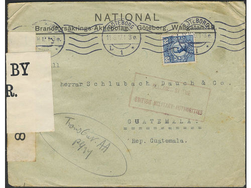 Sweden. Facit 85 on cover, 20 öre on censored cover sent from GÖTEBORG 11.8.17 to Guatemala with cancel RELEASED BY THE.. Läs mer Sweden. Facit 85 on cover, 20 öre on censored cover sent from GÖTEBORG 11.8.17 to Guatemala with cancel RELEASED BY THE BRITISH MILITARY AUTHORITIES. Arrival pmk 26.SET.1919. Visa mindre