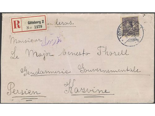 Sweden. Facit 89 on cover, 35 öre on registered cover sent from GÖTEBORG 31.12.18 to Persia with several arrival pmks on the reverse. Sweden. Facit 89 on cover, 35 öre on registered cover sent from GÖTEBORG 31.12.18 to Persia with several arrival pmks on the reverse. Visa mindre