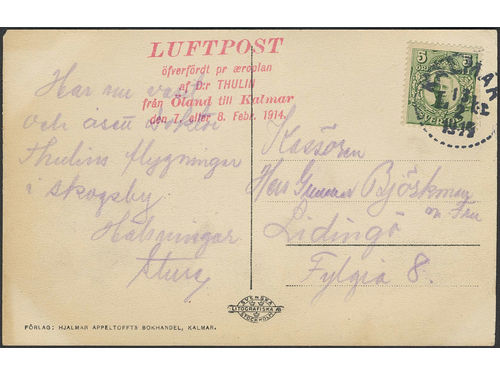 Sweden. Facit 79 on cover, 5 öre on postcard sent with special pioneer air mail flight 'LUFTPOST öfverfördt pr æroplan a.. Läs mer Sweden. Facit 79 on cover, 5 öre on postcard sent with special pioneer air mail flight 'LUFTPOST öfverfördt pr æroplan af D:r THULIN från Öland till Kalmar den 7. eller 8. Febr. 1914', cancelled KALMAR 13.2.1914. Visa mindre