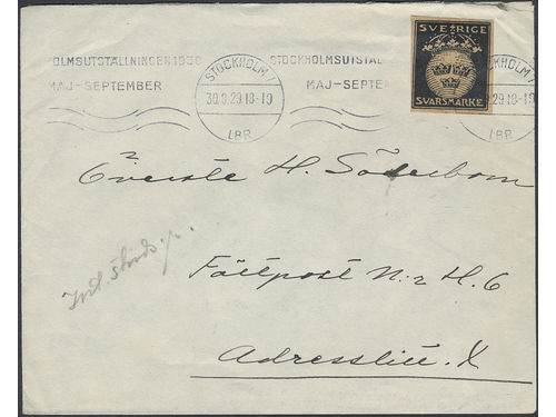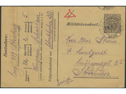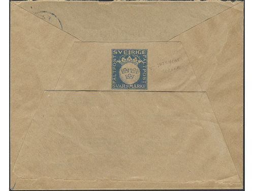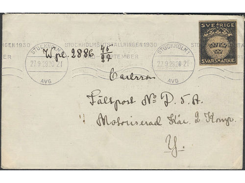 Sweden. Military postal stationary Facit M1, Reply-stamp on cover sent from STOCKHOLM 30.9.29 to the manoeuvres 26.9–2.10.1929. SEK 2500 Sweden. Military postal stationary Facit M1, Reply-stamp on cover sent from STOCKHOLM 30.9.29 to the manoeuvres 26.9–2.10.1929. SEK 2500 Visa mindre